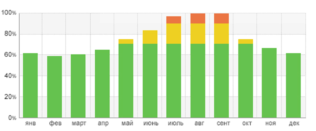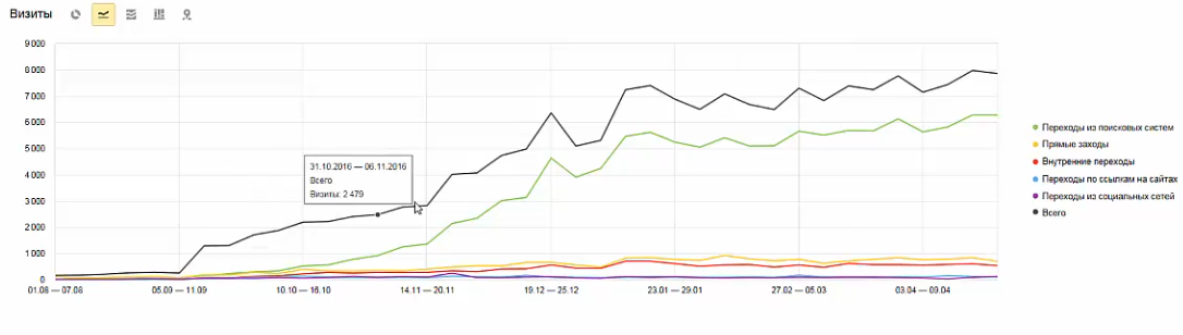 На скриншоте мы видим статистику посещаемости сайта по неделям. В итоге на апрель 2017 года посещаемость сайта составляла порядка 8000 человек в неделю, что соответственно нам приносит примерно 32000 человек в месяц и является весьма хорошим результатом.