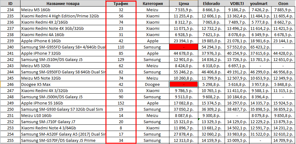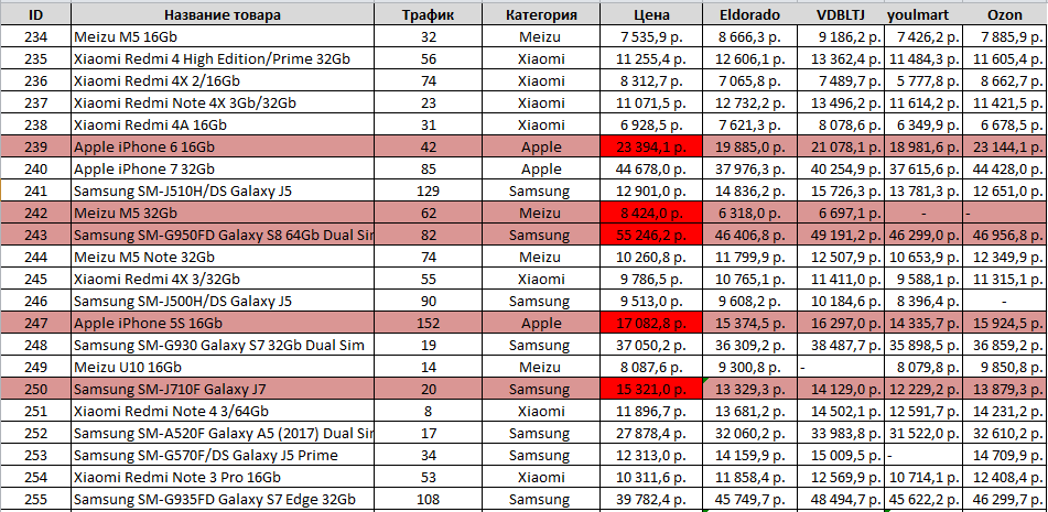 При анализе ценовой политики конкурентов, наша система формирует специальную таблицу, в которой есть поля с названием товара, ценой на нашем сайте, ценой у конкурентов (2-5 самых важных конкурента) и подсвечивает нам те позиции, на которых у нас цена завышена по сравнению с конкурентами.