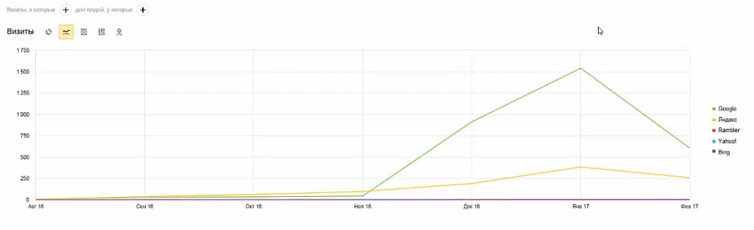 Также на графике мы можем увидеть, что в поисковой системе «Яндекс» трафик плавно, но стабильно увеличивался, а в «Google» был некий период так называемой «песочницы», после которой сразу же появилась положительная динамика: