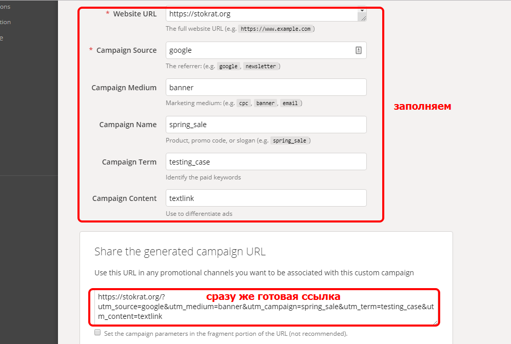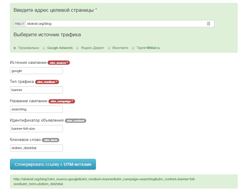 Campaign URL Builder (https://ga-dev-tools.appspot.com/campaign-url-builder/) — генератор ссылок от Google. Работает очень просто – заполняете все необходимые поля, а на выходе готовая ссылка будет сгенерирована автоматически.