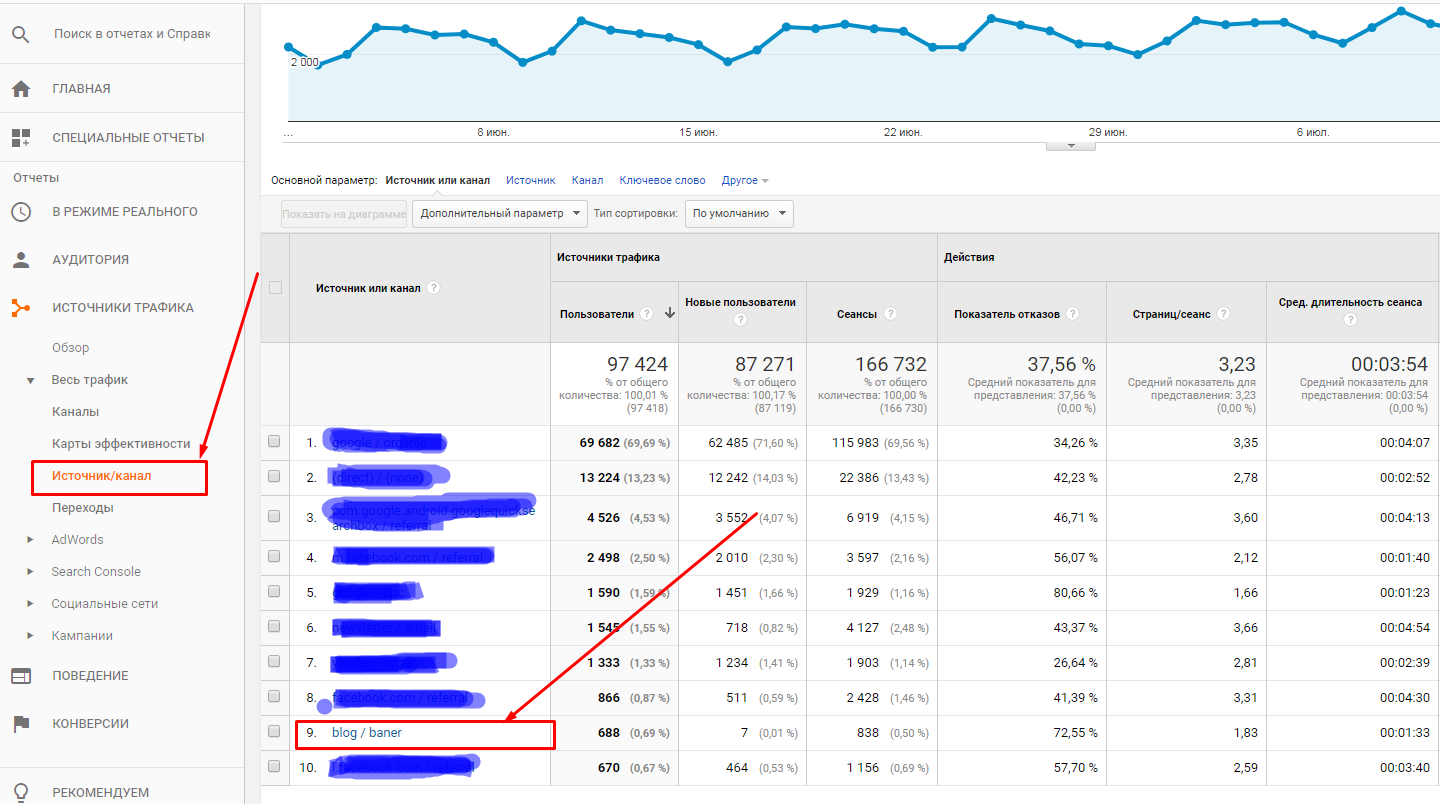 В Google Analytics можно зайти в «Источники трафика» → «Весь трафик» → «Источник/канал» и проанализировать трафик, полученный по меткам utm_source (источник) и utm_medium (канал). Выглядеть это будет примерно вот так: