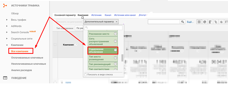 Плюс к этому, можно пройти по «Источники трафика» - «Кампании» - «Все кампании», в качестве дополнительного параметра выбрать «Реклама - Ключевое слово» и «Реклама - Содержание объявления» и получить еще один отчет – по меткам utm_campaign (Кампания), utm_term (Ключевое слово) и utm_content (Содержание объявления).