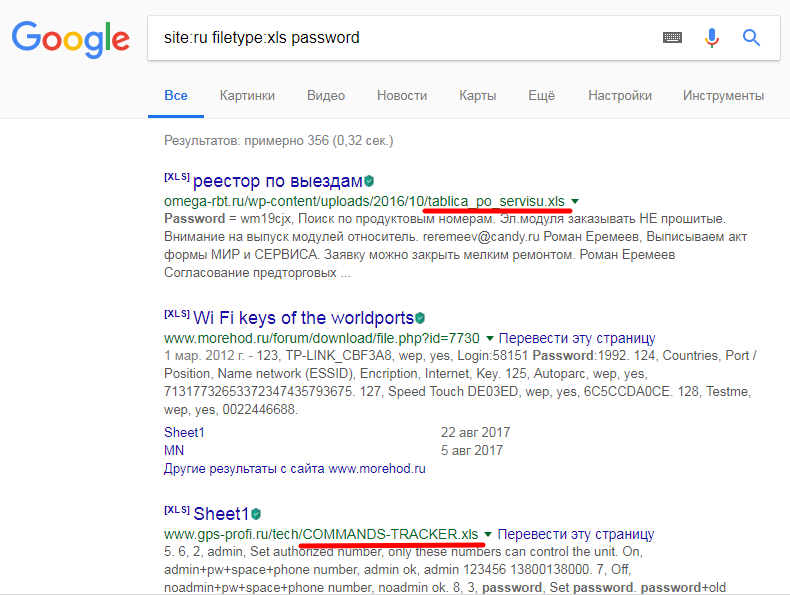 Дополнительно можно использовать оператор filetype: для того чтобы указать тип файла (например, XLS):